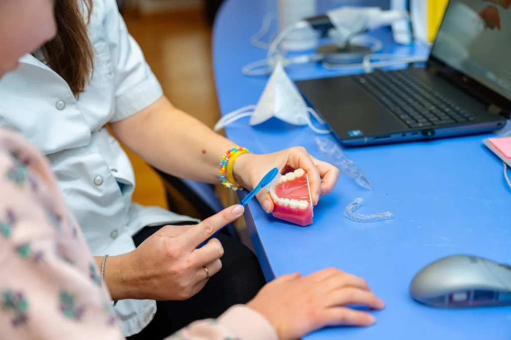 • Adopter un brossage minutieux : Brossez vos dents après chaque repas avec une brosse à dents à poils souples. Utilisez un dentifrice fluoré pour renforcer l’émail. Brossez chaque dent en insistant autour des bagues et des fils. Ne négligez pas les zones proches des gencives pour éviter les inflammations.